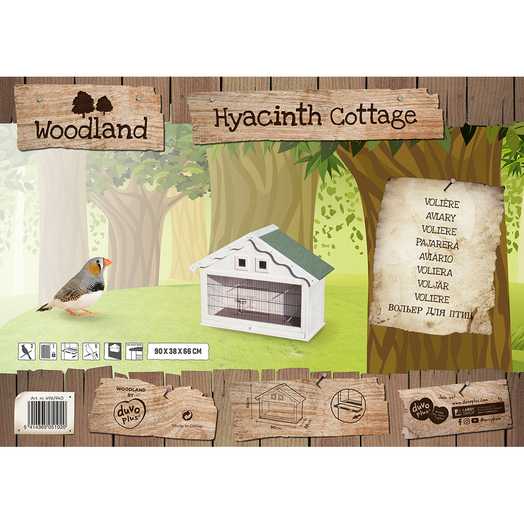De Woodland Voliere Hyacinth Cottage van duvoplus is een leuk vogelkooitje om een koppeltje tropische vogels of kanaries in te houden. Deze wandvolière beschikt over een uitschuifbare mestlade om zo eenvoudig de volière schoon te kunnen maken.