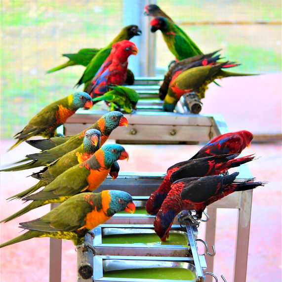 Lorikeets haben eine bürstenartige Zunge und ein spezielles Verdauungssystem, das für den Verzehr von Nektar, Pollen und Beerenfrüchten geeignet ist. Energie gewinnen sie aus den Einfachzuckern im Nektar (z. B. Saccharose, Glukose), während Pollen Eiweiß und andere essentielle Nährstoffe liefern.