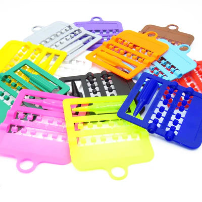Een handig kaartje met plastic splitringen en een praktisch lepeltje om de ringen eenvoudig rond de poot te plaatsen.