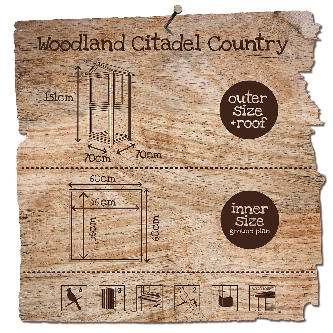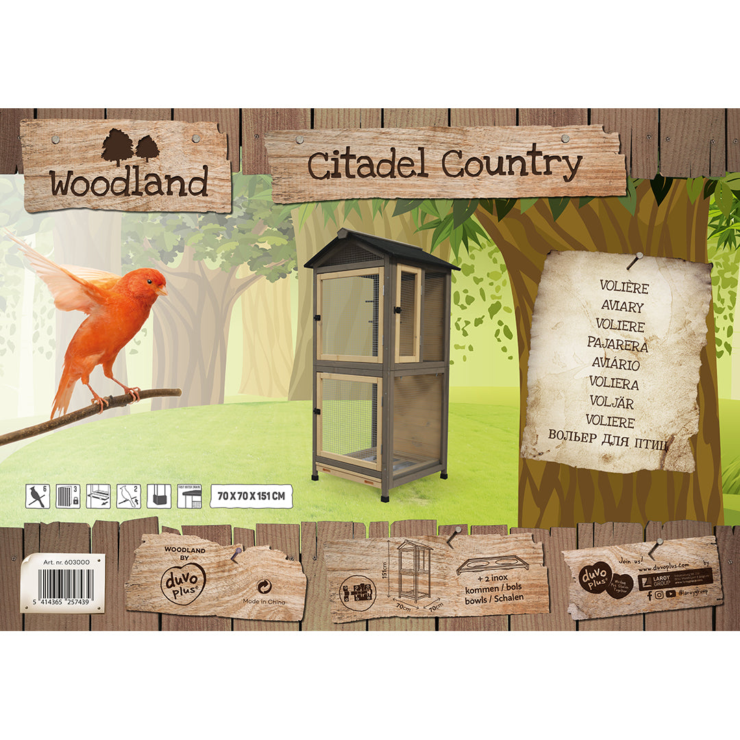 De Citadel Country van duvoplus is een volière die geschikt is om kleine vogels in te houden. Door zijn afmetingen is het eenvoudig om de volière tijdens de koude wintermaanden binnen te zetten. De volière beschikt frontaal over 2 grote deuren en 1 kleine toegang aan de zijkant. De volière is voorzien van 2 willekeurig te plaatsen zitstokken, ideaal om een 6-tal vogels in te huisvesten. Het uitschuifbaar metalen bassin zorgt voor meer hygiëne en maakt het eenvoudiger om de kooi schoon te maken. De volière is al éénmalig gebeitst maar wij adviseren u om dit periodiek te herhalen ter bevordering van de duurzaamheid.